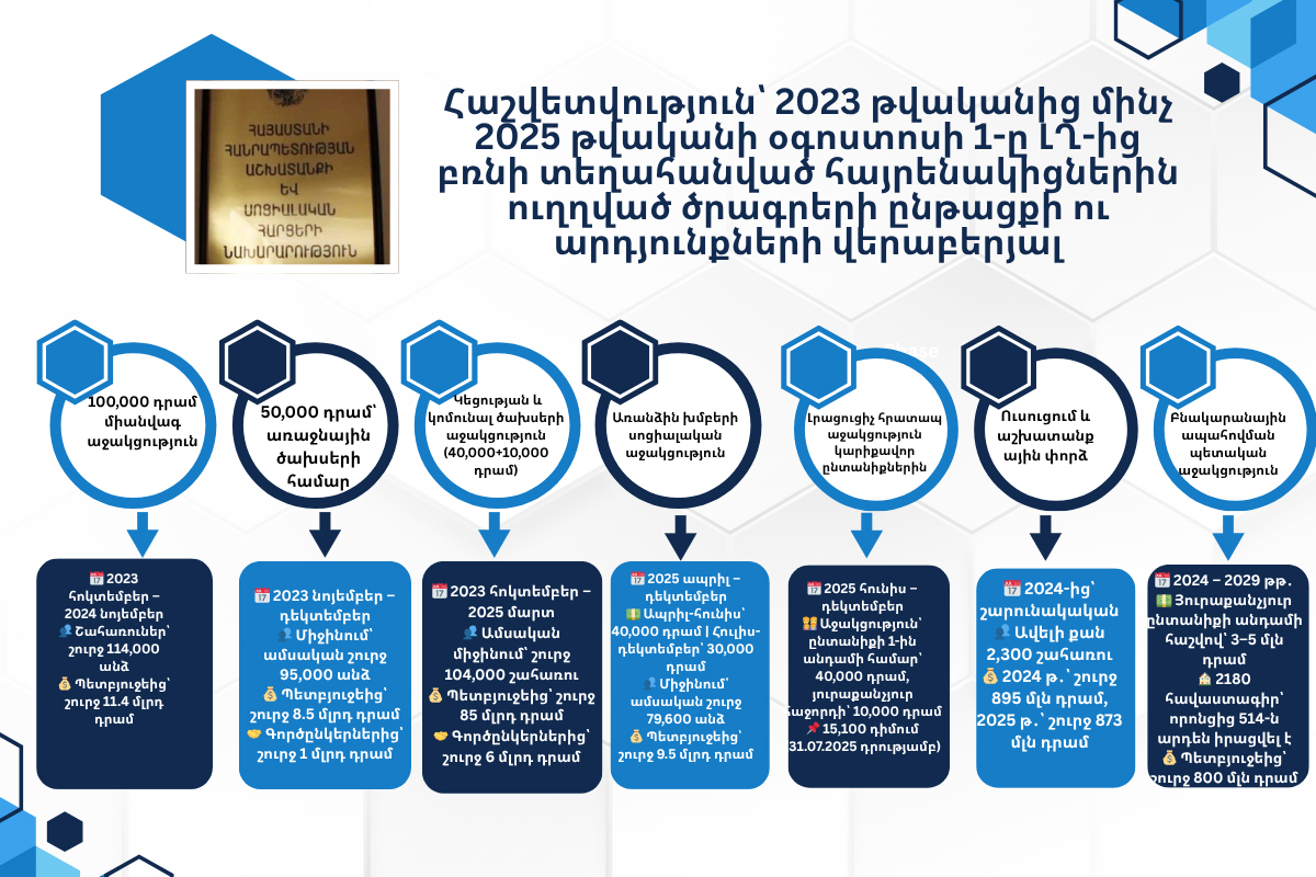 Հաշվետվություն՝ 2023 թվականից մինչ 2025 թվականի օգոստոսի 1-ը ԼՂ-ից բռնի տեղահանված հայրենակիցներին ուղղված ծրագրերի ընթացքի ու արդյունքների վերաբերյա մամուլի հաղորդագրություն